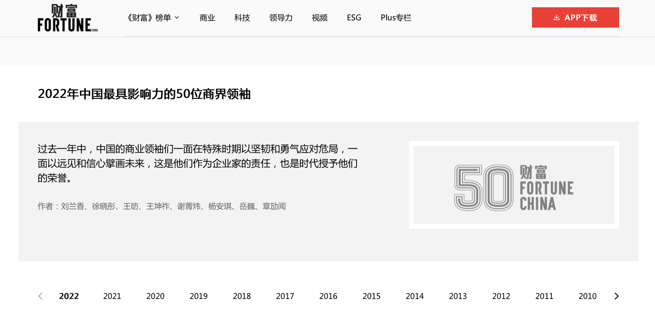 據了解,《財富》于2005年開始評選“中國最具影響力的商界領袖”。
