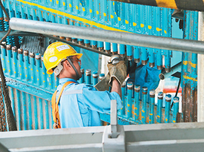一名中國施工人員正在進行鍋爐受熱面打磨對口作業。本報記者 劉 剛攝