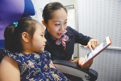 乘務員利用機上無線網絡幫助無陪小旅客與家人空地聯絡。(資料圖片)