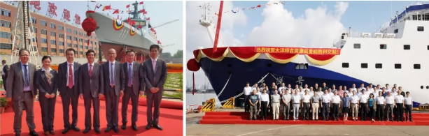以上左圖:馬來西亞瀕海任務艦首艦“KERIS”號下水;右圖:“大洋號”綜合資源調(diào)查船交船儀式。
