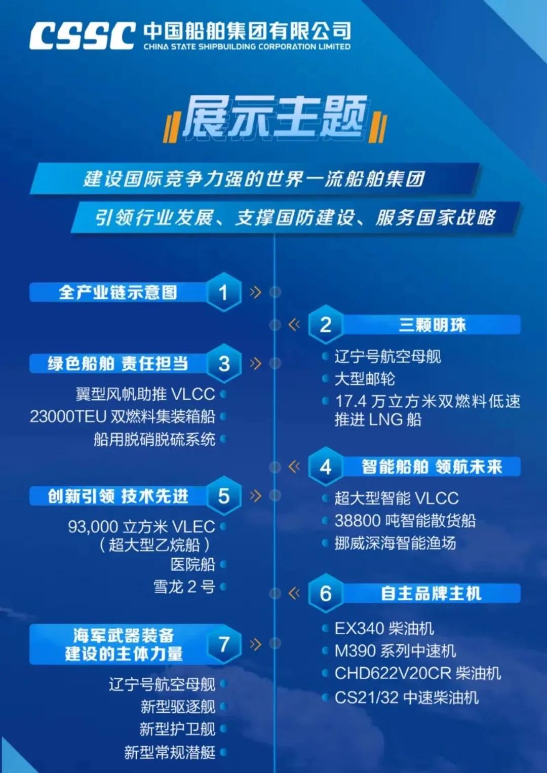 船舶海工裝備產業展區 分為船舶與海洋工程、船舶配套2個大區,整體展示了中國船舶集團強大的船舶建造能力。船舶與海洋工程分為海洋運輸與工程裝備,海洋資源開發、海洋科考裝備,海洋漁業,新開發船型與船舶改裝等六大板塊;船舶配套區包括動力與配套、機電裝備和電子信息裝備3大部分,共展出模型及實物68個,重點聚焦自主品牌、系列化產品及國際領先產品,展示了中國船舶集團在業界最為完整齊全的船舶動力機電配套產業鏈,具備提供穩定、可靠的全動力和配套解決方案的能力。