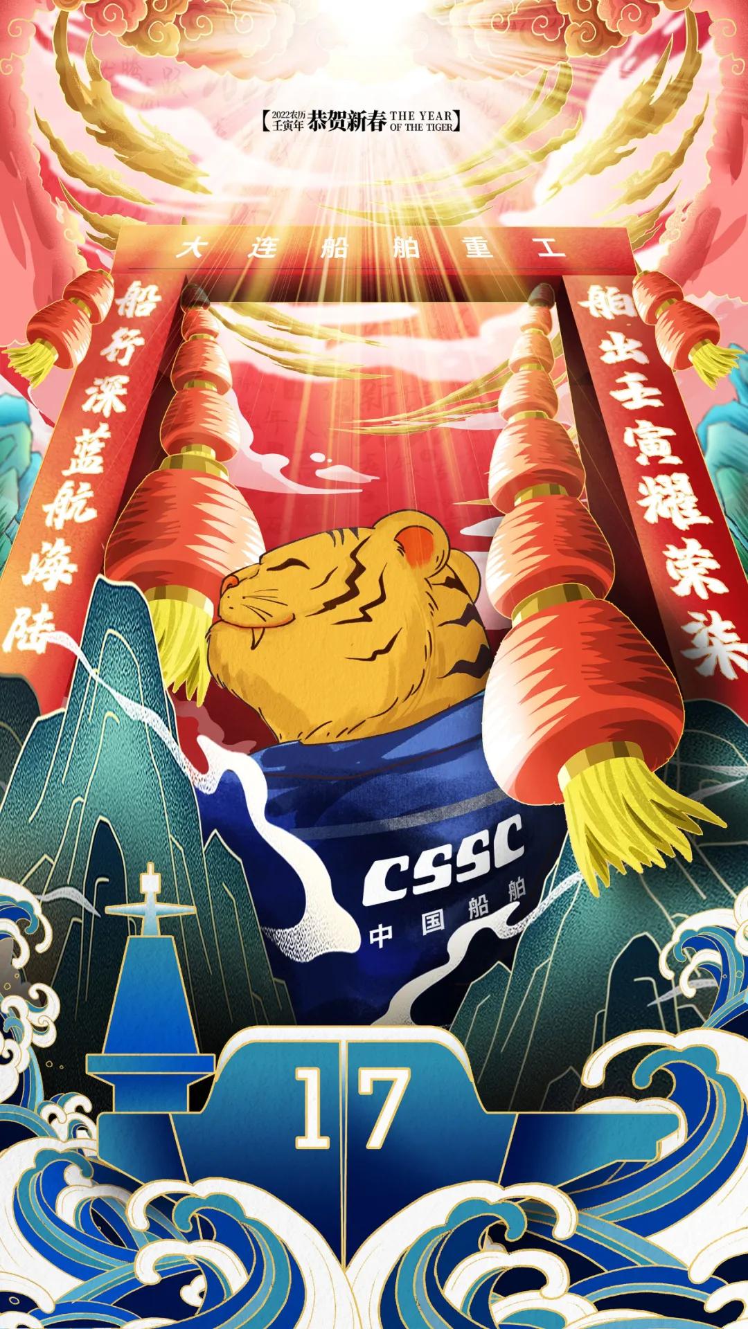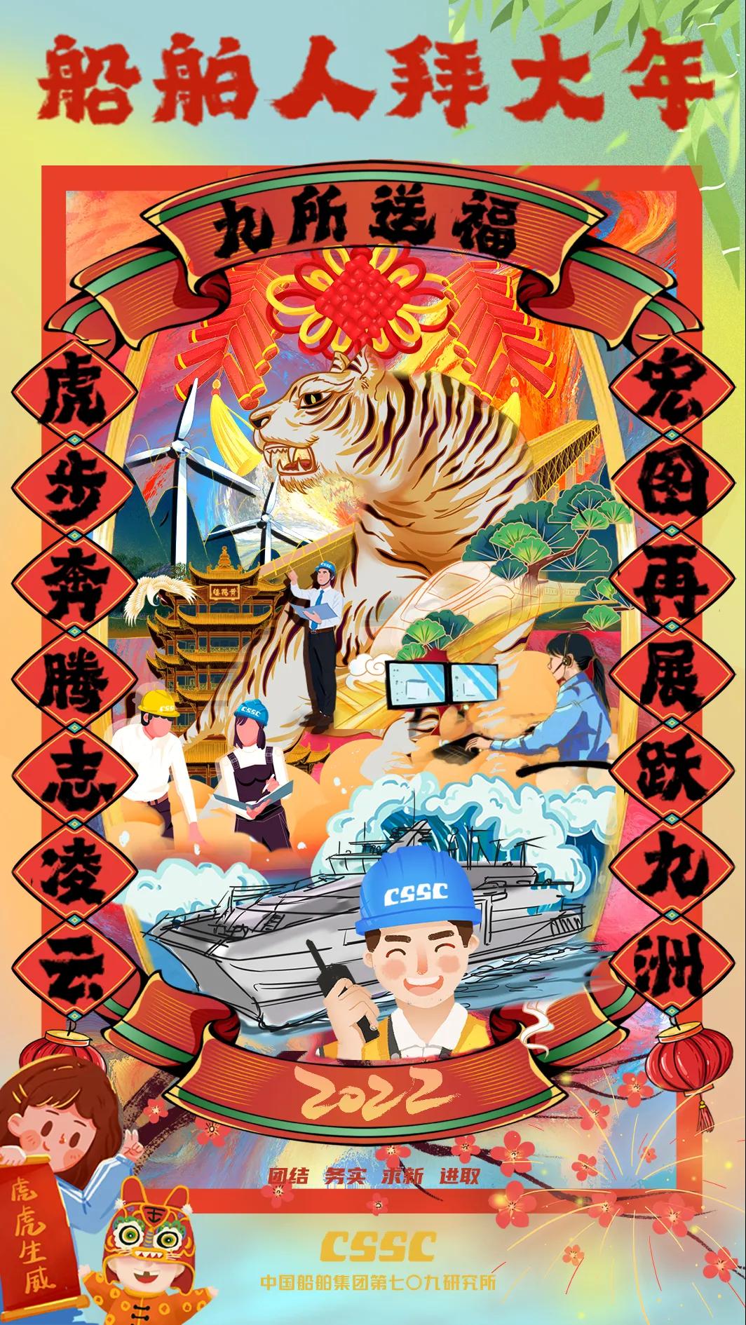 海報采用國潮畫風,中間部分“江小南”穿著新衣舉著虎頭,寓意新的一年中國船舶人虎虎生威,上面部分以重要產品和廠區設備為主,詮釋江南造船建造國之重器的初心和使命,同時輔以鞭炮、煙花、燈籠等新年元素,使海報充滿喜慶祥和的新年氛圍。