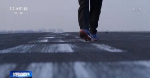 總臺(tái)央視記者李寧:這個(gè)就是在陸地上來模擬航母艦載機(jī)著陸的平臺(tái)。我們?cè)谶@個(gè)地方呆了兩天,直到今天日落黃昏,才終于有機(jī)會(huì)走上這個(gè)平臺(tái)。因?yàn)樗炤d機(jī)訓(xùn)練的頻次非常頻繁,我們只有在訓(xùn)練的間歇,才有機(jī)會(huì)帶大家來看一下。這里都是黑黢黢的一片,所以這個(gè)地方就叫做黑區(qū)。這一道道胎印就見證著這支艦載機(jī)部隊(duì)從無到有,一步步成長(zhǎng)的過程。
