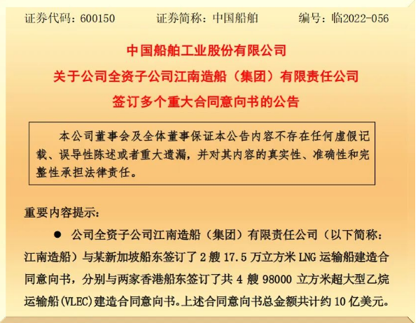 10月25日,中國船舶集團(tuán)有限公司旗下上市公司中國船舶工業(yè)股份有限公司發(fā)布《關(guān)于公司全資子公司江南造船(集團(tuán))有限責(zé)任公司簽訂多個重大合同意向書》的公告。根據(jù)公告,江南造船共與相關(guān)船東簽署了2型6艘約10億美元新船建造合同意向書。